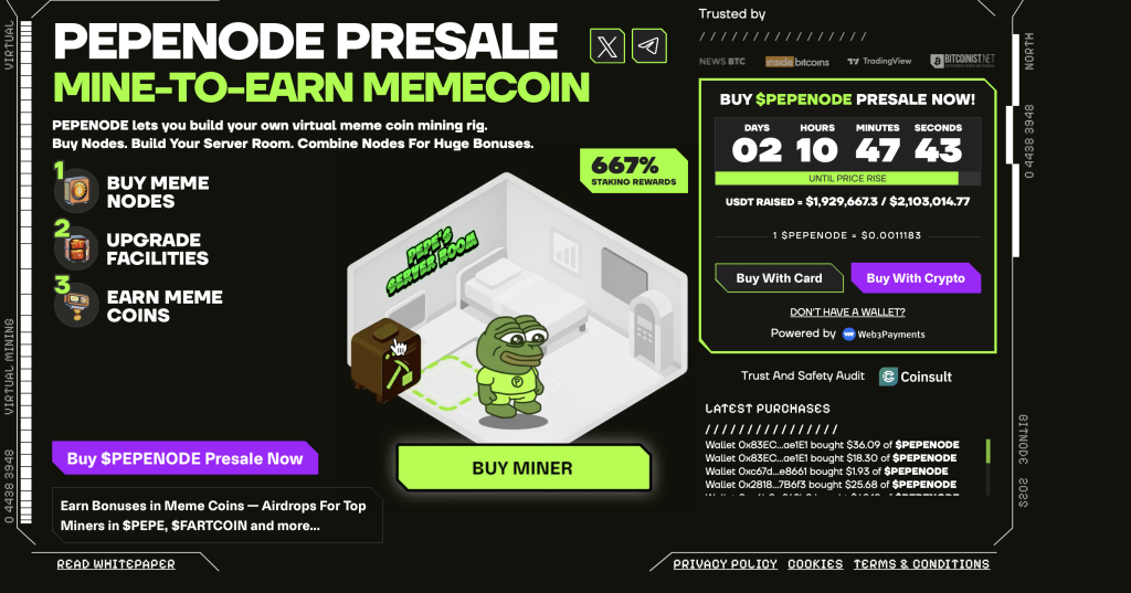 Schon in der Vorverkaufsphase steuert Pepenode auf 2 Millionen Dollar zu und der Preis wird während des Presales schon mehrfach erhöht, sodass frühe Investoren bereits von einem ersten Buchgewinn profitieren, bevor der neue Coin an den Börsen gelistet wird. Außerdem sorgt eine integrierte Staking-Funktion dafür, dass Anleger ein passives Einkommen in Form von zusätzlichen $PEPENODE-Token generieren können.