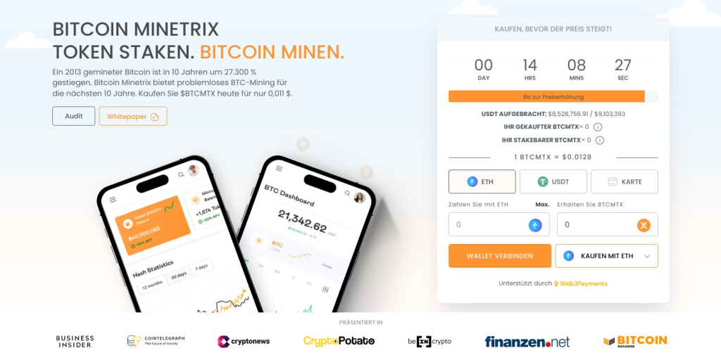 Zudem zeichnet sich Bitcoin Minetrix durch Benutzerfreundlichkeit und vielfältige Zahlungsoptionen wie ETH, USDT oder Bankkarten aus.