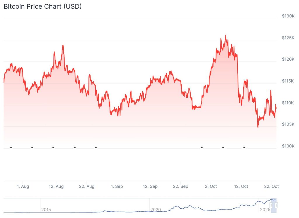 Die Leitwährung des Kryptomarktes blieb nicht von der starken Volatilität verschont, die in den letzten Wochen zu beobachten war. Geopolitische und wirtschaftliche Unsicherheiten, wie die Verschärfung des Zollkonflikts zwischen den USA und China sowie eine möglicherweise drohende Bankenkrise, sorgten für erhebliche Turbulenzen an den Märkten. Besonders die Ankündigung möglicher 100 % Strafzölle der USA auf Importe aus China führte am 10. Oktober zu einem Flash Crash. Im Zuge dessen fiel Bitcoin von über 120.000 $ auf 110.000 $.