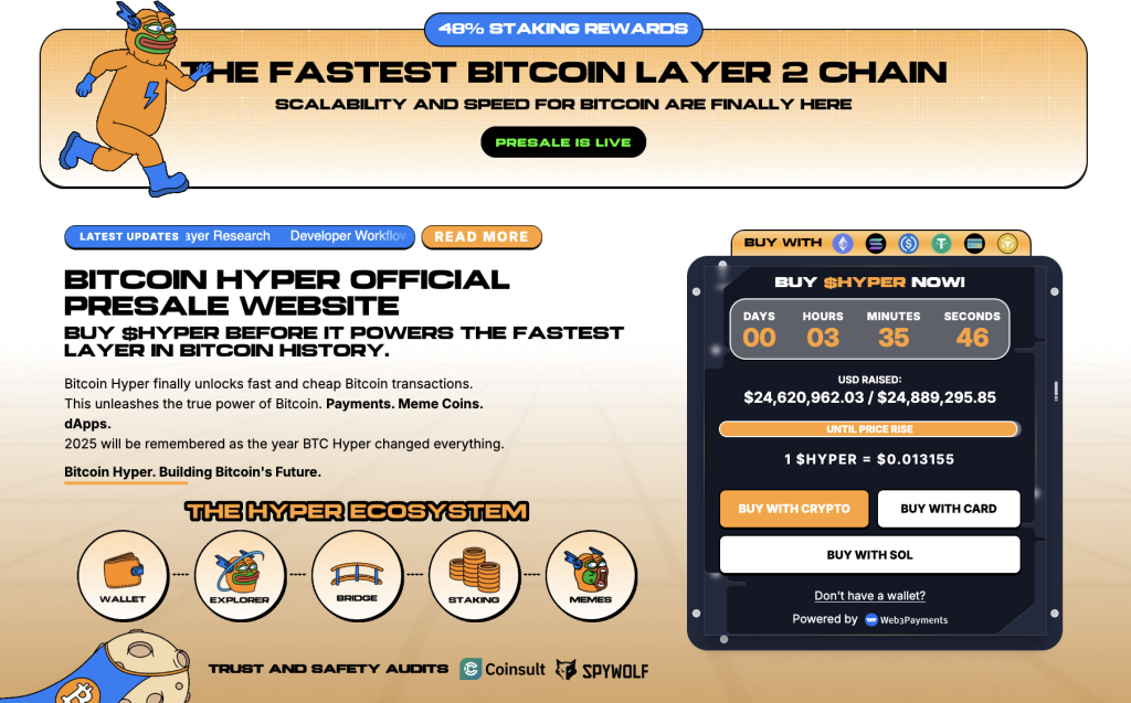 Zudem können die im Presale erworbenen Coins für eine jährliche Rendite von bis zu 48 % gestakt werden. Das Spannendste an dem Projekt ist das Ziel der Entwickler, mit Bitcoin Hyper eine funktionierende L2-Blockchain für Bitcoin auf den Markt zu bringen. Bis heute verfügt Bitcoin noch über keine derartige L2-Lösung, obwohl die Blockchain längst an ihre Kapazitätsgrenzen stößt.