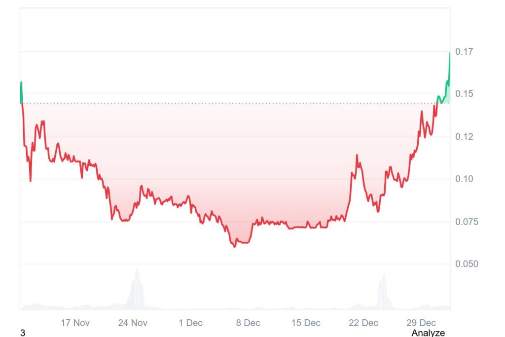 Nachdem CC alle wichtigen Widerstandsmarken bei 0,10 US-Dollar und 0,15 US-Dollar überwunden hatte, nahm die Rallye in den letzten Stunden regelrecht parabolische Züge an. Seit gestern schoss der Kurs um über 20 % in die Höhe, und im Monatsvergleich liegt CC inzwischen rund 131,79 % im Plus. Erst vor wenigen Minuten erreichte der Coin einen neuen Allzeithöchststand von etwa 0,175 US-Dollar.