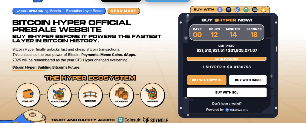 Bitcoin Hyper kommt mit dem $HYPER-Token und da dieser aktuell noch im Vorverkauf erhältlich ist, handelt es sich hier um eine einmalige Gelegenheit für Investoren, von Anfang an dabei zu sein, wenn ein neuer Altcoin mit neuer Blockchain auf den Markt kommt. Schon jetzt explodiert die Nachfrage, sodass inzwischen über 31,5 Millionen Dollar investiert wurden. Das führt Analysten zu der Annahme, dass es sich hier um ein Multi Milliarden Dollar Projekt handeln könnte, was für frühe Investoren extrem hohe Renditen bedeuten würde.