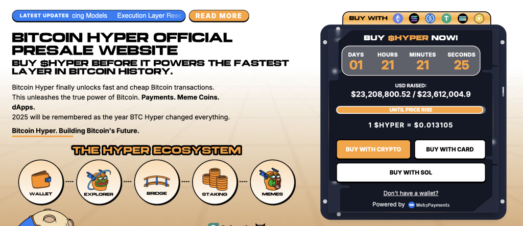 Der dazugehörige $HYPER-Token befindet sich aktuell im Presale, der sich zu einem der erfolgreichsten der letzten Jahre entwickelt hat. Bereits über 23 Millionen Dollar wurden investiert, obwohl der Token noch gar nicht an den Börsen handelbar ist. Analysten gehen davon aus, dass sich der Kurs nach dem Launch um ein Vielfaches steigern könnte, sollte sich die Hyper Chain als Standardlösung für Bitcoin-DeFi etablieren. In einigen Prognosen ist sogar von bis zu 100x Potenzial die Rede.
