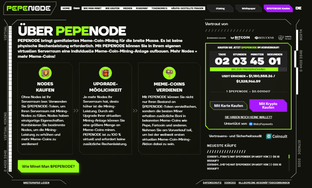 Während erfahrene Investoren wie MMCrypto Gewinne absichern,wollen viele den letzten Push noch voll mitnehmen. PepeNode ($PEPENODE) verfolgt einen neuartigen Ansatz im Meme-Sektor, der Mining als Spiel neu erfindet. Nutzer bauen virtuelle Mining-Rigs auf, die durch Upgrades Token-Erträge bringen. Jeder Ausbau verbrennt 70 Prozent der eingesetzten Tokens, was für ein deflationäres Modell sorgt. Der ICO hat bereits 1,18 Millionen US-Dollar eingesammelt, und Investoren können ihre Bestände schon jetzt staken – mit dynamischen Rewards von über 1.100 Prozent APY.