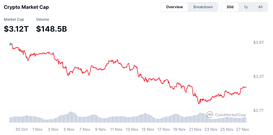 Nach Wochen nicht enden wollender Korrekturen scheint sich der Kryptomarkt gerade endlich wieder zu fangen. Zuletzt war die Gesamtmarktkapitalisierung von Spitzenwerten bei 4,28 Billionen $ auf einen Tiefststand von zwischenzeitlich nur noch 2,82 Billionen $ eingebrochen. Dementsprechend flossen über 1,4 Billionen $ an Marktkapitalisierung aus Bitcoin und Altcoins ab. Von diesem Tiefststand ist die Gesamtmarktkapitalisierung jetzt schon wieder auf 3,12 Billionen $ in die Höhe geschossen.