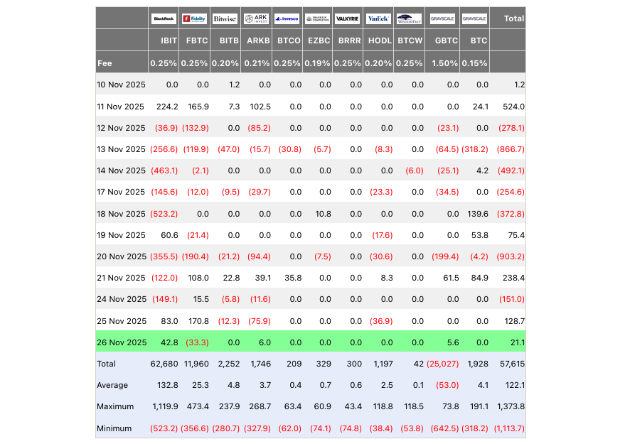 Ein positives Reversal zeichnet sich indes auch bei den Bitcoin-Spot-ETFs ab. Die hatten in den letzten Wochen ja so starke Abflüsse verzeichnet wie noch nie zuvor. Nun gab es bereits wieder einige Tage mit Nettozuflüssen. Am 25. November investierte BlackRock allein wieder 83 Millionen $ in BTC, und die Gesamt-Nettozuflüsse beliefen sich auf 128,7 Millionen $.