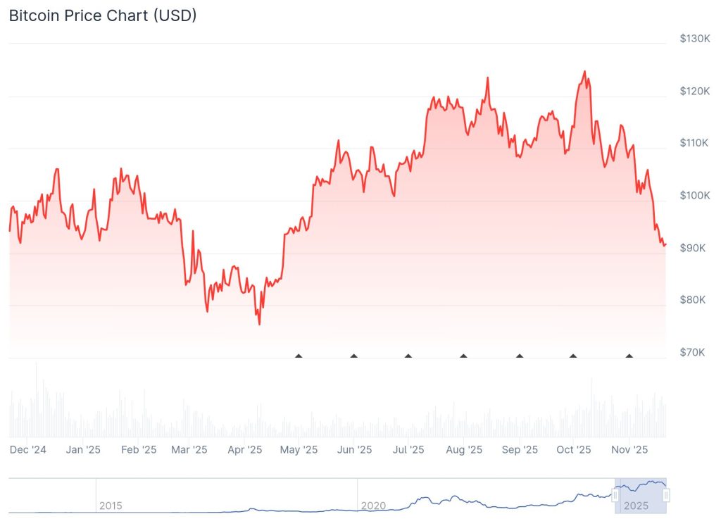 Der Kryptomarkt befindet sich heute ganz klar im Korrekturmodus. Bitcoin ist von einem All-Time-High Anfang Oktober bei 126.000 $ auf aktuell nur noch knapp über 90.000 $ zurückgefallen. Gleichzeitig ist die Bitcoin-Marktdominanz überraschenderweise gesunken. Überraschenderweise deshalb, weil sich in Phasen von Bitcoin-Korrekturen häufig ein erst einmal kontraintuitiver Anstieg der Bitcoin-Marktdominanz abzeichnet.