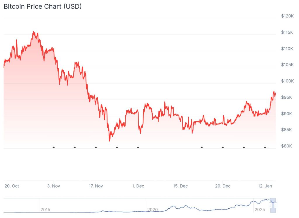 Am Kryptomarkt ging es in den letzten Tagen wieder deutlich aufwärts. Nachdem BTC seit dem heftigen Flash-Crash im November 2025 in einer Konsolidierungsrange zwischen 85.000 und 100.000 $ festgesteckt hatte, gelang es den Bullen am 3. Januar endlich nachhaltig, über die 90.000-$-Marke auszubrechen. Zwischen dem 8. und 11. Januar erfolgte nochmals ein Retest der 90.000-$-Marke und seitdem ist der BTC-Kurs nicht mehr aufzuhalten. Inzwischen notiert die Leitwährung des Kryptomarkts wieder bei 96.890 $.