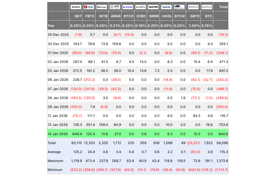 An diesem Tag gab es erstmals wieder einen kleinen Nettozufluss von 116,7 Millionen $. Darauf folgte am 13. Januar ein massiver Nettozufluss von 753,8 Millionen $, der schließlich heute noch einmal durch einen Zufluss in Höhe von 840,6 Millionen $ übertroffen wurde. Bemerkenswert dabei: Rund 648,4 Millionen $, also etwa ein Drittel der gesamten Zuflüsse, gehen auf den IBIT-Spot-ETF von BlackRock zurück. Der hatte sich über die letzten Jahre klar als Top-BTC-ETF hervorgetan, in den inzwischen mehr investiert wurde, als in alle anderen Bitcoin-Spot-ETFs zusammen.