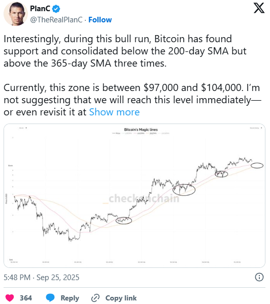 Der Analyst PlanC verweist auf die historische Bedeutung gleitender Durchschnitte im Bitcoin-Markt. Laut seinen Analysen hat Bitcoin in früheren Bullenmärkten während Korrekturen regelmäßig zwischen dem 200- und dem 365-Tage-SMA konsolidiert. Diese Zone liegt aktuell zwischen 97.000 und 104.000 US-Dollar und könnte bei weiteren Rücksetzern eine starke Unterstützung bieten.