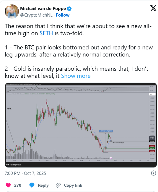 Der zweite Faktor ist makroökonomischer Natur. Gold befindet sich aktuell in einer extrem parabolischen Bewegung, die laut van de Poppe früher oder später eine Gegenreaktion auslösen dürfte. Wenn der Goldpreis nach dieser Übertreibungsphase zu fallen beginnt, erwarten viele Marktbeobachter eine Verschiebung hin zu risikoreicheren Anlageklassen. Dieser “Risk-on”-Effekt könnte Kapital in Kryptowährungen lenken, wobei besonders Ethereum profitieren könnte.