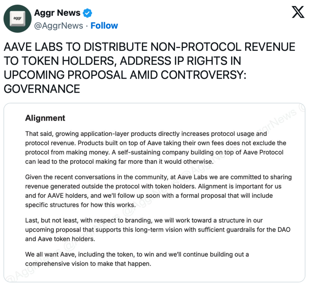 Kritiker bemängelten, dass diese Einnahmen bisher an Aave Labs flossen, statt dem DAO-Treasury oder Tokenhaltern. Kulechov erklärte nun, eine Struktur vorzulegen, die „non-protocol revenues“ verteilt, einschließlich Erträgen aus Branding-Lizenzen, Infrastrukturservices und anderen Aktivitäten.