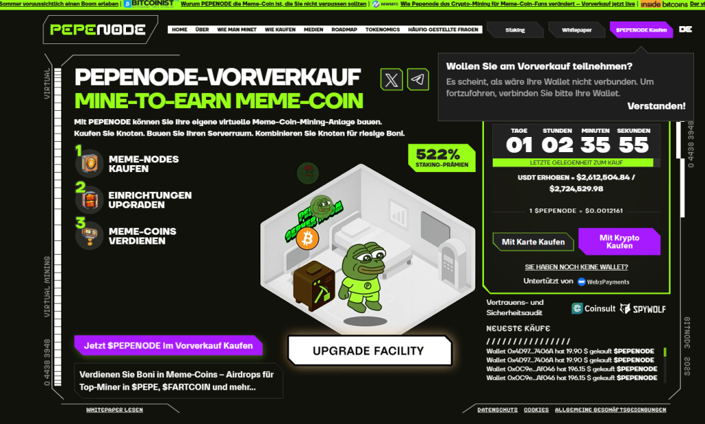 Abseits der großen Namen sorgt Pepe Node für angespannte Investorengesichter. Der Memecoin steht im Presale inzwischen bei rund 2,7 Millionen US-Dollar. In weniger als 24 Stunden startet der Handel auf dezentralen Börsen. Das Staking-Modell bietet weiterhin 522 Prozent Prämie. Genau diese Kombination zieht spekulatives Kapital an. Mehrere Marktbeobachter rechnen zum Start mit hoher Volatilität.