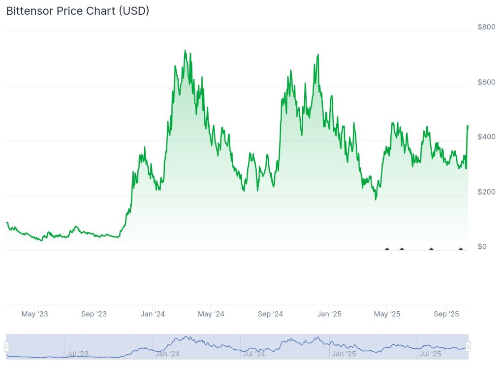 Nun hat der Coin nach dem jüngsten Flash Crash jedoch einen starken Rebound verzeichnet und wird aktuell wieder bei 460 $ gehandelt. Das bringt TAO auf eine Marktkapitalisierung von 4,43 Milliarden $ und macht ihn zum 28. größten Coin überhaupt.