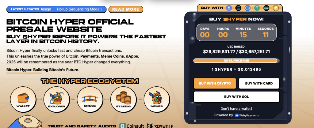 Die sogenannte Hyper Chain nutzt die Solana Virtual Machine als Ausführungsschicht und ermöglicht damit schnelle, günstige Transaktionen sowie den Zugang zu DeFi-Anwendungen wie Staking, Lending und dezentralem Handel, direkt auf Basis von Bitcoin. Dadurch könnte BTC vom reinen Wertspeicher zu einem aktiv genutzten Rendite-Asset werden. Entsprechend hoch ist das Interesse am $HYPER-Token, der aktuell noch im Vorverkauf erhältlich ist. Bereits fast 30 Millionen US-Dollar wurden investiert, was viele Analysten zu der Einschätzung bringt, dass Bitcoin Hyper nach dem Launch zu den stärkeren Performern im Altcoin-Segment zählen könnte.