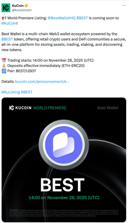 Mit seiner starken Nutzerbasis und nun einem großen Börsen-Listing wird der BEST Token von leistungsstarken Netzwerkeffekten profitieren, bei denen jeder neue Nutzer und jede neue Funktion die Gesamtnachfrage nach Token verstärkt. Einfach ausgedrückt: Wenn Best Wallet wächst, wächst BEST mit, weil der Token das gesamte Ökosystem antreibt. Im aktuellen Markt konkurrieren Top-Börsen intensiv darum, Assets mit echtem Momentum zu listen. Wenn KuCoin ein Projekt früh listet, insbesondere eines mit den Adoptionsmetriken von Best Wallet, löst dies oft eine Listing-Kettenreaktion aus.
