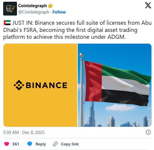 Die Region positioniert sich als führender Standort für Innovationen im Bereich digitale Assets, der starke Regulierung mit geschäftsfreundlicher Infrastruktur verbindet. Für globale Investoren und Unternehmen, die regulatorische Klarheit suchen, macht die zunehmende Bedeutung des ADGM die VAE zu einer natürlichen Anlaufstelle für internationale Expansion. Die Erreichung dieses Meilensteins eröffnet Binance Zugang zu anspruchsvollen Märkten, staatlich gestütztem Vertrauen und neuen Partnerschaften.