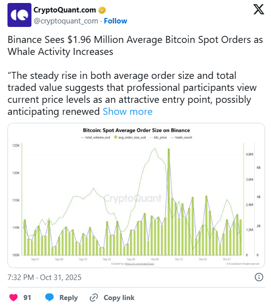 Eine neue von CryptoQuant veröffentlichte Analyse zeigt im Oktober eine deutliche Verschiebung im Spot-Orderflow. Bei Binance erreichte die durchschnittliche Ordergröße im Bitcoin-Spotmarkt rund 1,96 Millionen US-Dollar. Das ist ein Niveau, das üblicherweise nicht von kleineren Spekulanten, sondern von institutionellen Marktteilnehmern bewegt wird. Parallel dazu stieg der gesamte Spotumsatz auf etwa 2,82 Milliarden US-Dollar.