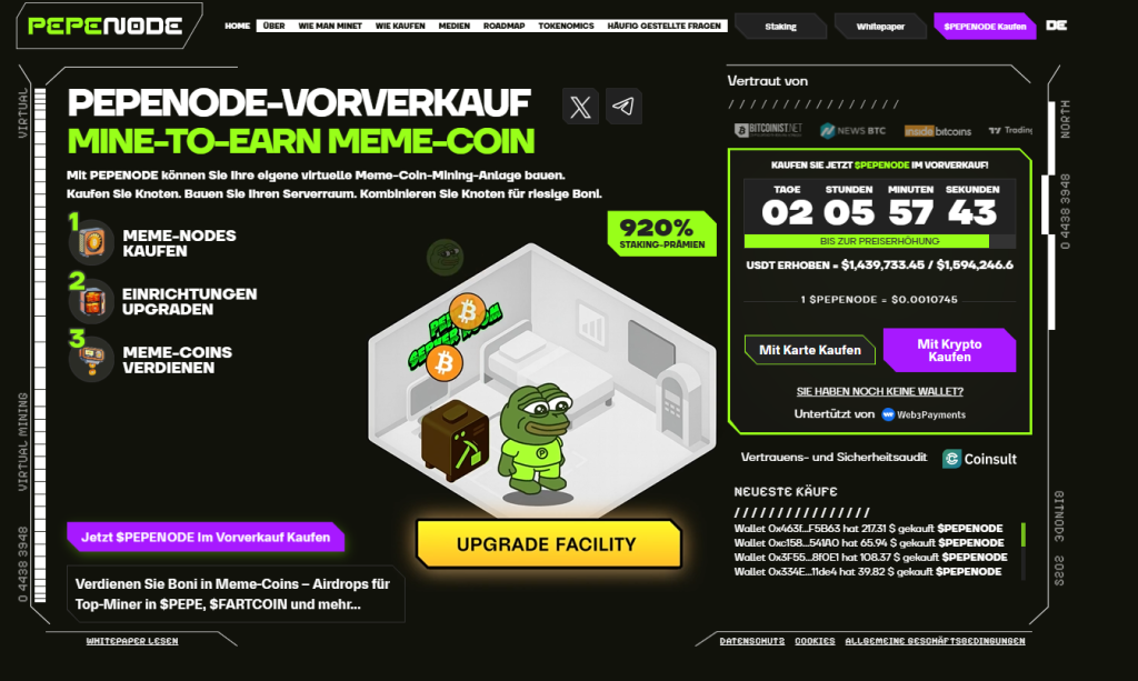 Gerade dieser Gegensatz öffnet Raum für neue Konzepte, die Mining in einer anderen Art für die Kleinanleger interessant machen kann. Statt ein Wettrüsten bei Rechenleistung und Energieverbrauch zu veranstalten, setzt PepeNode ($PEPENODE) mit einem gamification Ansatz an. Das Projekt verwandelt den Mining-Prozess in ein Game, bei dem Nutzer virtuelle Rigs aufbauen, Nodes kombinieren und durch clevere Strategien höhere Belohnungen freischalten können. Mining wird so von einer teuren Belastung zu einem strategischen Wettbewerb, der Spaß macht und gleichzeitig echte Token-Erträge bringen kann.