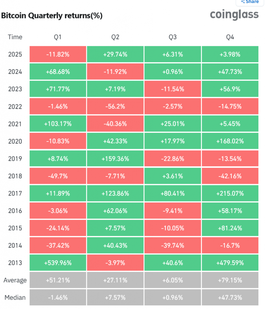 Besonders bemerkenswert ist der zeitliche Kontext – die Monate Oktober bis Dezember gelten historisch als Rallye-Phase im Kryptomarkt, wobei vor allem der November als Rekordmonat gilt. Das vierte Quartal weist mit einer durchschnittlichen Steigerung von 79,15 Prozent die beste Performance im Jahresverlauf auf, wie Daten von Coinglass zeigen. Die Erwartung ist groß, dass die finale Welle des aktuellen Bullenmarktes jetzt anläuft.