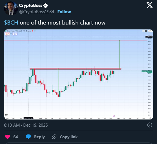 Immer mehr Analysten halten einen Durchbruch des 600-US-Dollar-Widerstands nur noch für eine Frage der Zeit. So teilte der Analyst Crypto Boss jüngst seine Einschätzung, dass der BCH-Chart derzeit einer der konstruktivsten überhaupt sei und bei einem Ausbruch über 600 US-Dollar schnell eine Rallye in Richtung 1.000 US-Dollar folgen könnte. Ein anderer Analyst verweist darauf, dass Binance-Top-Trader ihre BCH-Long-Positionen derzeit massiv aufstocken.