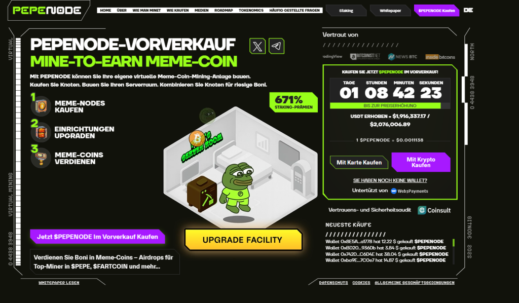Das Interesse ist groß: Im laufenden Presale hat PepeNode bereits 1,9 Millionen US-Dollar eingesammelt. Das Projekt verspricht ein sauberes, interaktives und energieeffizientes Mining-Erlebnis. Spieler bauen virtuelle Serverräume, optimieren ihre Hashrate und werden für strategisches Handeln belohnt. Damit könnte das Memecoin Projekt schnell an Nutzer und Investoren gewinnen, was nach dem Launch zu entsprechenden Kurssteigerungen führen könnte. Natürlich bleibt das Risiko auch hoch, wie das Spiel im Kryptobereich den meisten Investoren bekannt ist.
