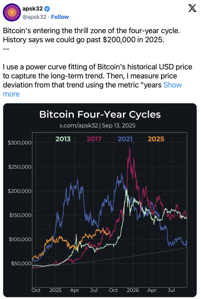 Die Analyse von apsk32 verweist auf ein potenziell entscheidendes Stadium im typischen Vier-Jahres-Zyklus von Bitcoin. Mithilfe einer Power-Curve-Analyse wird der langfristige Preistrend abgebildet und die Abweichung zum aktuellen Kurs gemessen. Dieses Maß zeigt, wie weit der Markt seiner eigenen Trendlinie vorausläuft und erlaubt den Vergleich mit den Zyklen von 2013, 2017 und 2021.