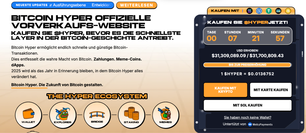 In einem Marktumfeld, das zunehmend von institutionellem Kapital und wachsendem Interesse geprägt ist, gewinnen solche technologischen Erweiterungen an Bedeutung, da sie den praktischen Nutzen von Bitcoin langfristig erhöhen könnten. Aktuell ist der HYPER-Token im Vorverkauf erhältlich und schon in dieser frühen Phase explodiert die Nachfrage, sodass inzwischen bereits über 31 Millionen Dollar in das Projekt investiert wurden. Es wird daher vermutet, dass der Kurs nach dem Börsenstart schnell um ein Vielfaches steigen könnte. Während institutionelle Investoren wie Binance und ARK Invest massiv Bitcoin akkumulieren, nutzen Privatanleger die Volatilität, um sich in aufstrebenden Projekten zu positionieren.