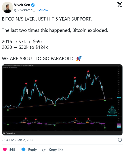Bitcoin steht aktuell an einem spannenden Punkt. Das Bitcoin-/Silber-Verhältnis notiert laut dem Analysten Vivek Sen auf einem Fünfjahres-Support. Historisch erwies sich dieses Niveau als Ausgangspunkt für massive Aufwärtsbewegungen. In früheren Zyklen folgten von vergleichbaren Relationen aus starke Rallyes, da Kapital verstärkt aus klassischen Sachwerten in Bitcoin floss. Auch aktuell wirkt das Chance-Risiko-Verhältnis attraktiv: Die Abwärtsrisiken erscheinen begrenzt, während das Aufwärtspotenzial deutlich überwiegt.