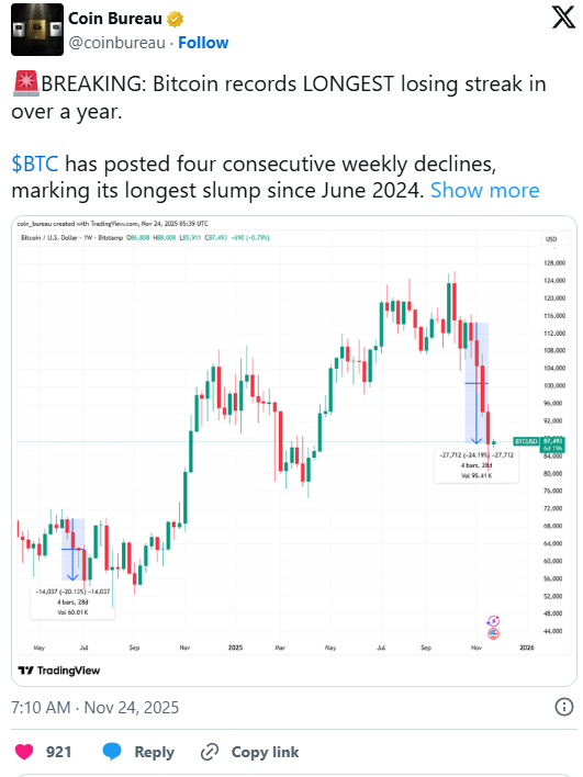 Vier Wochenkerzen hat Bitcoin nun in Folge im roten Bereich, also im Verlust, geschlossen. Das gab es zuletzt im Juni 2024. Obwohl dieses Jahr schon einige schlechte Nachrichten für Bitcoin bereitgehalten hat und auch schon den einen oder anderen Crash mitbrachte, ist das Ausmaß der aktuellen Verlustserie in diesem Jahr beispiellos. Schon mit vier Wochen handelt es sich um die längste Durststrecke für Bitcoin in diesem Jahr. Allerdings steht noch im Raum, dass das noch nicht das Ende sein könnte, da die digitale Leitwährung auch jetzt in der neuen Woche bereits leicht im Minus notiert.