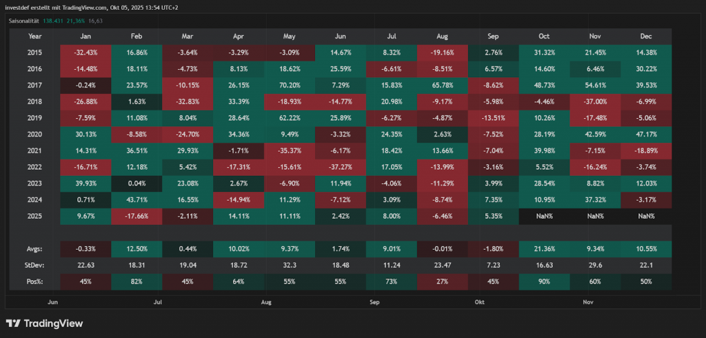 Betrachtet man die Saisonalität von Bitcoin im Oktober, wird auf einen Blick klar, weshalb dieser Monat unter Krypto-Enthusiasten als “Uptober” bezeichnet wird. Im saisonalen Durchschnitt steigt Bitcoin im Oktober um mehr als 21 Prozent an. Zudem erzielt der Kurs der Kryptowährung im Oktober in mehr als 90 Prozent der Fälle einen Gewinn.
