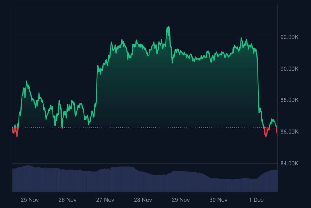 Bitcoin startet nicht mit einem Raketenstart in den Dezember, sondern mit einem unsanften Sturz. Am 1. Dezember rutschte der Kurs zeitweise unter 86.000 Dollar. Ethereum fiel parallel in den Bereich um 2.800 Dollar, und der Kryptomarkt gab in kurzer Zeit einen dicken Batzen seiner Marktkapitalisierung ab.