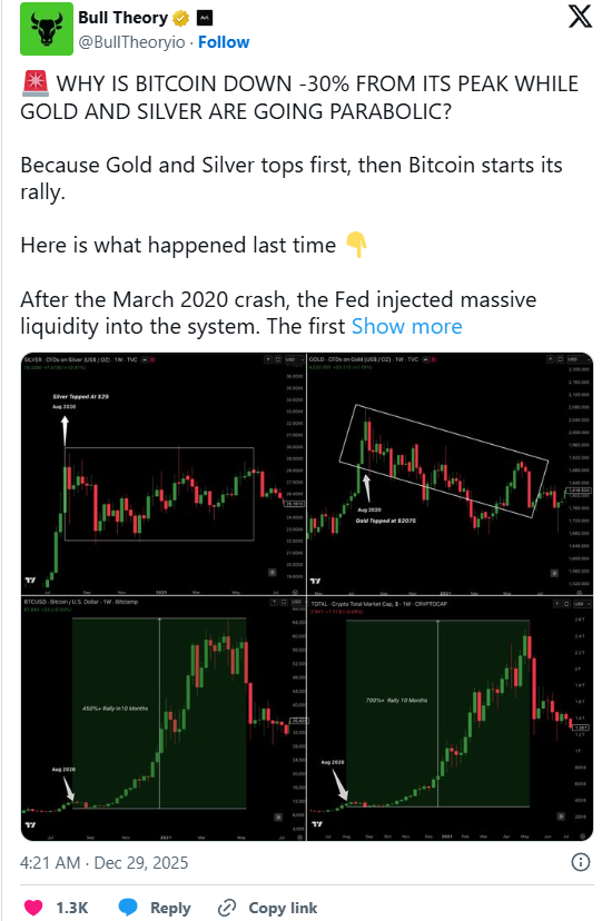 Genau in dieser Phase startete Bitcoin seine eigentliche Rallye. Innerhalb von neun Monaten stieg der Kurs von rund 12.000 Dollar auf fast 65.000 Dollar. Der gesamte Kryptomarkt vervielfachte sich in dieser Zeit sogar noch stärker. Bull Theory sieht heute auffällige Parallelen. Gold notiert nahe neuer Rekordstände um 4.500 Dollar, Silber ist auf rund 80 Dollar gestiegen. Bitcoin hingegen konsolidiert, ähnlich wie damals. Auch diesmal ging einer größeren Seitwärtsphase ein massives Liquidationsereignis voraus, nämlich der starke Abverkauf Anfang Oktober.