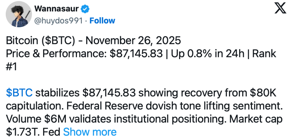 Aktuell notiert Bitcoin bei rund 87.145 US-Dollar und hat sich damit deutlich von der kurzfristigen Kapitulation auf 80.000 US-Dollar in der vergangenen Woche erholt – eine Bewegung, die viele Analysten als mögliches lokales Tief werten.