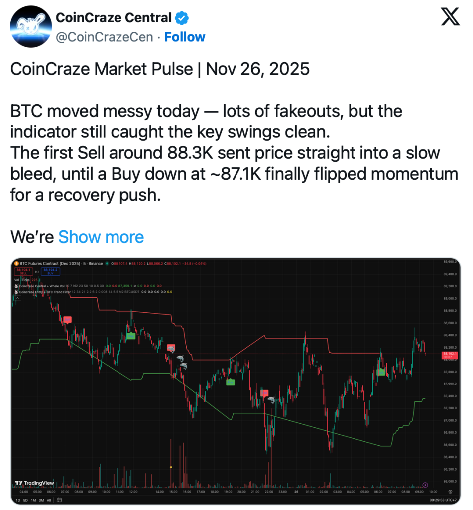 Bitcoin zeigte sich heute erneut extrem volatil. Mehrere schnelle Kursbewegungen sorgten sowohl bei Tradern als auch bei automatisierten Handelssystemen für Unsicherheit. Dennoch blieb der wichtigste technische Indikator stabil und lieferte klare Signale für die intraday-Entwicklung. Das erste größere Warnsignal erschien bei rund 88.300 US-Dollar, als ein Verkaufssignal mit nachlassendem Momentum zusammenfiel und einen mehrstündigen, langsamen Rückgang einleitete.