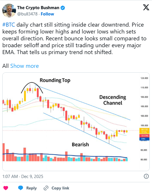 Auf dem Tageschart befindet sich Bitcoin weiterhin in einem klaren Abwärtstrend. Die Kursbewegungen verlaufen innerhalb einer Struktur aus tieferen Hochs und tieferen Tiefs, was dem Markt eine starke bärische Neigung gibt. Der jüngste Bounce ist vorhanden, wirkt aber im Vergleich zum breiten Abverkauf klein, und Bitcoin handelt weiterhin unter allen wichtigen exponentiellen gleitenden Durchschnitten. Die 20-, 50-, 100- und 200-EMAs sind bärisch gestapelt und nach unten gerichtet – ein klassisches Bild eines kontrollierten Abwärtstrends, in dem Rallyes selten anhalten.