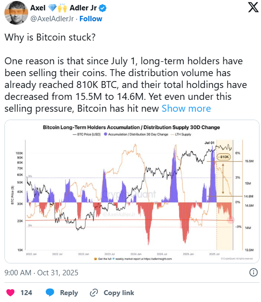 Trotz stabiler Nachfrage, insbesondere durch ETFs und institutionelle Investoren, bleibt Bitcoin in einer Phase der Stagnation. Der Hauptgrund liegt in einem strukturellen Verkaufsdruck von langfristigen Haltern. Seit Anfang Juli haben diese sogenannten Long-Term Holder laut On-Chain-Daten rund 810.000 BTC abgegeben, wodurch ihre Gesamtbestände von 15,5 auf 14,6 Millionen Coins gesunken sind.