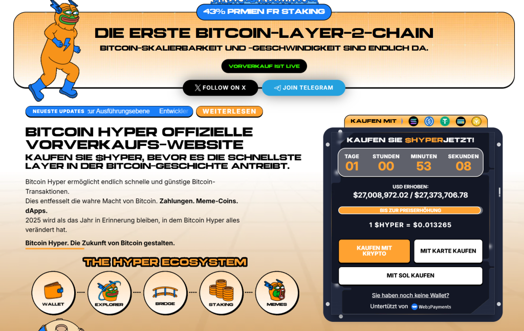 Der Presale von Bitcoin Hyper erreicht inzwischen 27 Millionen US-Dollar. Das Timing ist auffällig, denn in Phasen, in denen Bitcoin keine klare Richtung findet, steigt oft das Interesse an Projekten, die neue technische Ansätze in das Ökosystem bringen. So scheint auch dieser eigentlich risikoreiche Memecoin großen Anklang bei der Investorenschutz zu erhalten. Schon mehrere Whales sind mit 100k US-Dollar und mehr investiert, was für ein Memecoinprojekt unüblich ist. Scheinbar sehen auch Großanleger eine gute Chance für einen Anstieg des $HYPER Kurses.