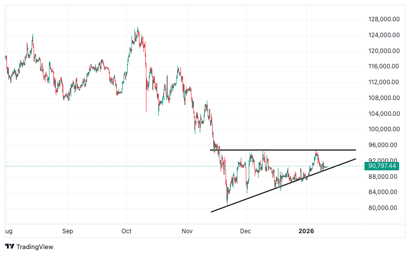 Im kurzfristigen Zeitfenster zeigt sich ein steigendes Keilmuster. Während der Kurs oberhalb des Supports bleibt, deutet der rückläufige RSI auf nachlassendes Momentum hin. Ein Bruch unter die 90.000-Dollar-Marke könnte eine Bewegung in Richtung 88.000 US-Dollar auslösen. Auf der Oberseite würde ein nachhaltiger Ausbruch über 95.000 US-Dollar hingegen Raum für einen schnellen Anstieg in Richtung 98.000 bis 100.000 US-Dollar schaffen.