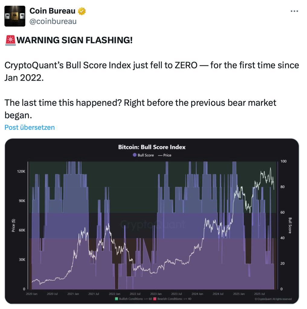 Am Freitag fiel der Bitcoin-Kurs (BTC) erneut unter die psychologisch wichtige Marke von 100.000 US-Dollar. Innerhalb einer Woche verlor die Kryptowährung rund 9 % an Wert und liegt mehr als 20 % unter ihrem Allzeithoch – nach klassischer Definition ein Bärenmarkt. Nun sorgt ein technisches Signal für zusätzliche Verunsicherung: Der CryptoQuant Bull Score Index steht erstmals seit 2022 wieder auf Null – ein Indikator, der schon damals den Beginn eines massiven Kursrückgangs ankündigte.