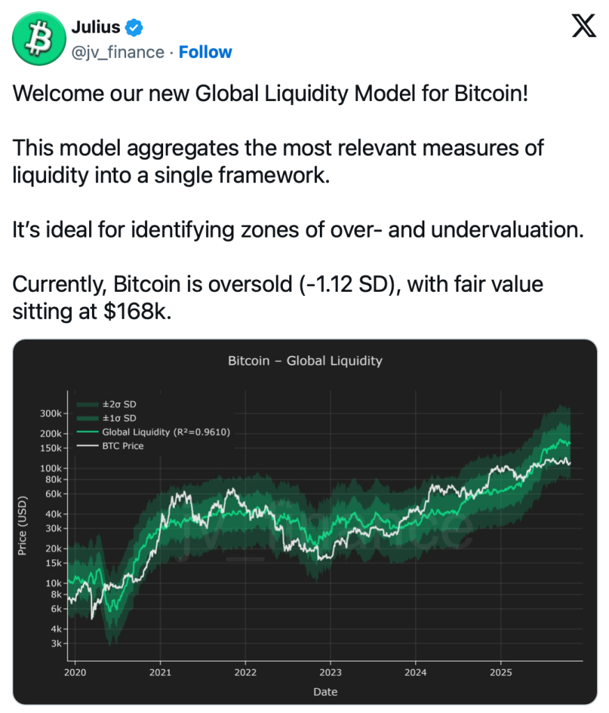 Der Analyst Julius von JV_Finance hat ein Global Liquidity Model for Bitcoin entwickelt, das Geldmengenwachstum, Zentralbankbilanzen und Kapitalflüsse kombiniert.