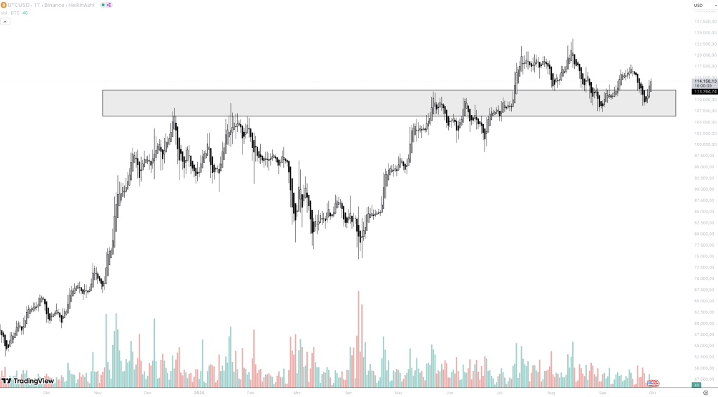 Bis Mittwoch, wenn der neue Monat und damit das vierte Quartal beginnt, erwarten die Analysten eine Verteidigung dieser Unterstützung. Das Zeitfenster ist deshalb besonders relevant, da Oktober und November historisch als starke Monate für Bitcoin gelten. Damit wird die aktuelle Woche zu einem wichtigen Prüfstein für die Marktstimmung. Hält der Support, könnte dies den Auftakt für eine potenziell ausgeprägte Q4-Rallye markieren.
