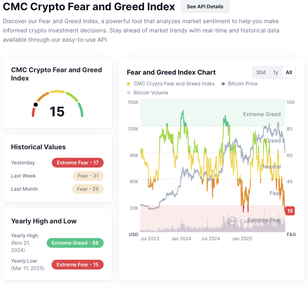 Gleichzeitig signalisiert der Fear-and-Greed-Index eine außergewöhnlich pessimistische Stimmung. Mit einem Wert von 15 wird extreme Angst gemessen, das niedrigste Niveau seit Beginn des Jahres.