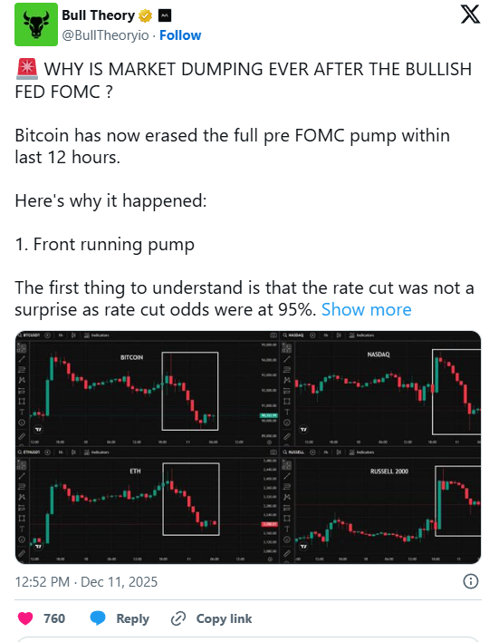 Die Zinssenkung um 0,25 Prozent kam nicht überraschend, da die Wahrscheinlichkeit bei 95 Prozent lag. Viele institutionelle Marktteilnehmer hatten bereits Tage vor der Sitzung entsprechende Positionen aufgebaut, wodurch der Anstieg vor der Fed-Entscheidung im Wesentlichen ein vorweggenommenes Ereignis darstellte.