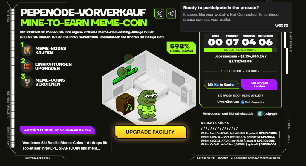 Noch 7 Stunden lang lassen sich PEPENODE zu 0,00115 US-Dollar sichern, bevor die nächste Preisstufe ansteht. Die Tokenomics des Memecoins setzen auf einen deflationären Mechanismus, bei dem 70 Prozent aller Upgrade-Token dauerhaft verbrannt werden. Dazu kommen geplante Listings, die den Zugang für breite Zielgruppen erleichtern sollen.
