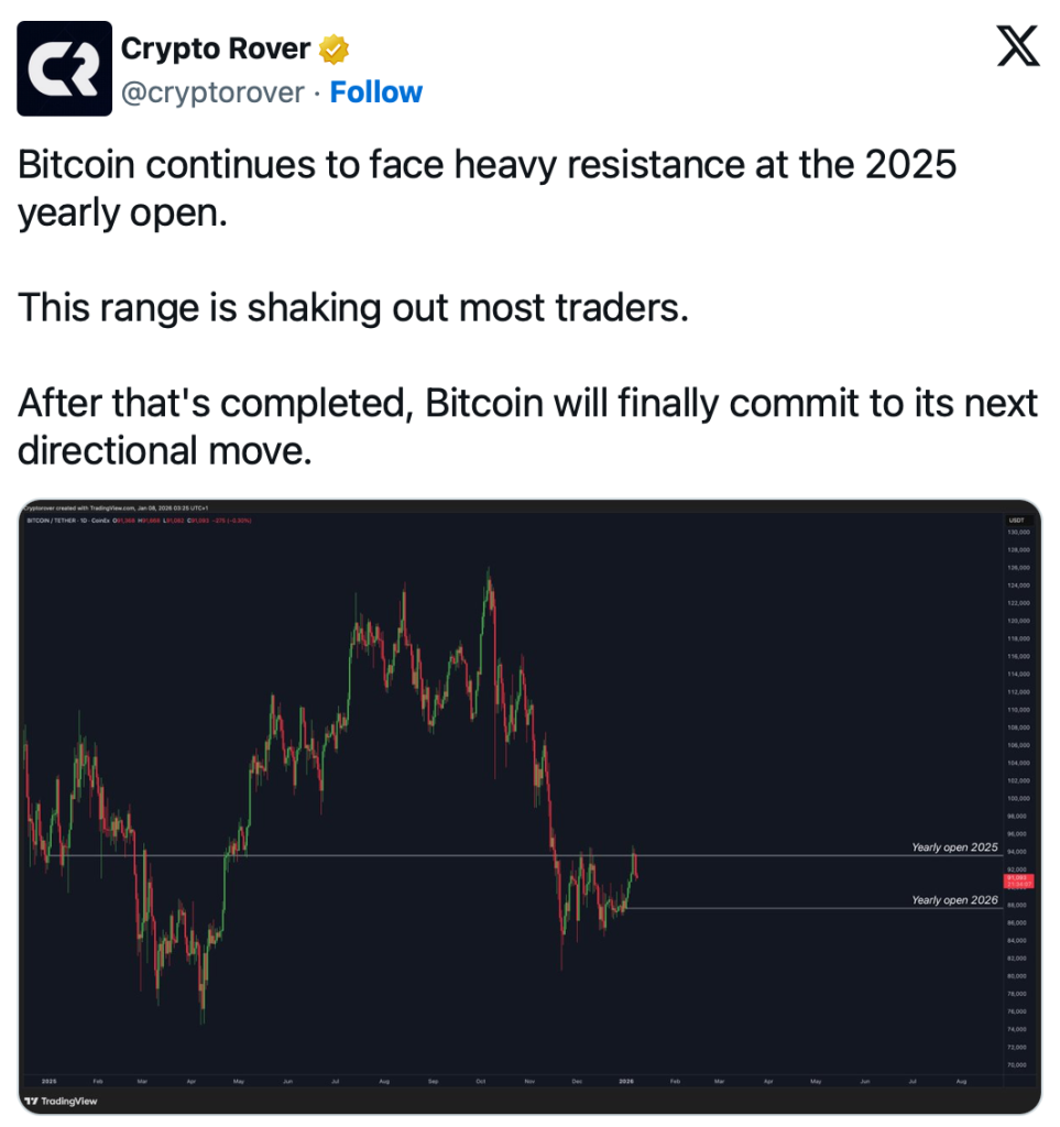Bitcoin kommt an einer der wichtigsten Marken des laufenden Zyklus nicht vorbei. Der Jahresopen 2025 wirkt weiterhin als massiver Widerstand und hat den Erholungsversuch klar ausgebremst. Nach einem Ausbruch aus der vorherigen Seitwärtsphase schob sich der Kurs kurz nach oben, drehte jedoch exakt im Widerstandsbereich und setzte anschließend zu einer ordentlichen Abwärtsbewegung an.