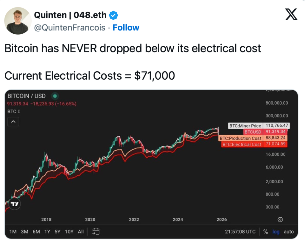 Bitcoin wird zunehmend wie ein digitaler Rohstoff betrachtet, dessen Preis durch reale Produktionskosten beeinflusst wird. Ein Analyst hat auf X darauf hingewiesen, dass der Bitcoin-Kurs historisch nie unter die reinen Energiekosten für das Mining gefallen ist – gemeint sind ausschließlich die Stromkosten, ohne weitere Betriebsausgaben wie Hardware oder Infrastruktur.