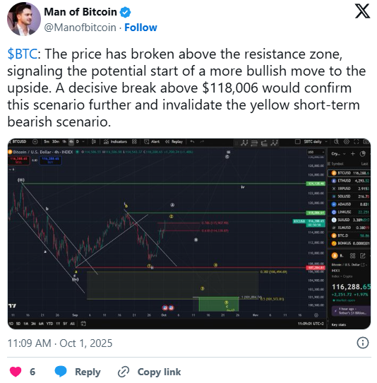 Bitcoin ist kürzlich über eine bedeutende Widerstandszone ausgebrochen, ein Schritt, den die meisten Analysten als möglichen Beginn eines längerfristigen bullischen Trends ansehen. Ein sauberer Ausbruch über $118.006, gemäß kurzfristiger Charts, würde diese Perspektive noch stärken. Dies würde nicht nur die strukturelle Stärke bestätigen, sondern auch bärische Strukturen umkehren, die in früheren Sitzungen mögliche Rücksetzer angedeutet hatten.