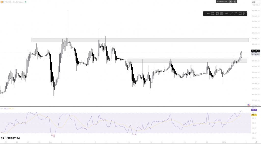 Aus technischer Sicht lässt sich bei Bitcoin zunehmend ein Ausbruch erkennen. Im Vier-Stunden-Chart ist zu sehen, dass der Kurs zuletzt den Bereich zwischen 89.500 und 90.500 US-Dollar überwinden konnte. Diese Zone hatte zuvor mehrfach als hartnäckiger charttechnischer Widerstand fungiert und wurde in den vergangenen Handelstagen immer wieder getestet. Mit dem jüngsten Anstieg gelingt Bitcoin erstmals seit Mitte Dezember ein nachhaltiger Bruch über dieses Niveau, was das kurzfristige Momentum klar stärkt.