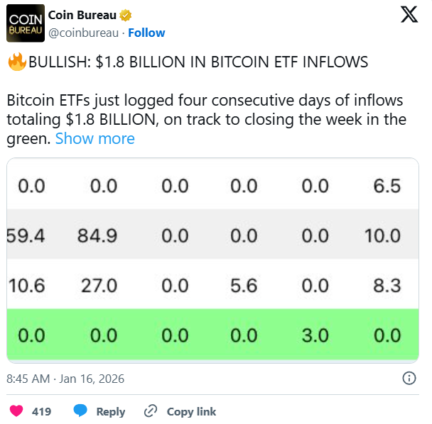 Zusätzlich zeigen die US-Bitcoin-Spot-ETFs zuletzt wieder deutliche Zuflüsse. Innerhalb von vier Tagen flossen insgesamt rund 1,8 Milliarden US-Dollar in diese Produkte. Diese Entwicklung deutet darauf hin, dass institutionelle Investoren erneut verstärkt Positionen aufbauen. Historisch gingen solche Phasen häufig mit neuen Aufwärtsbewegungen einher.